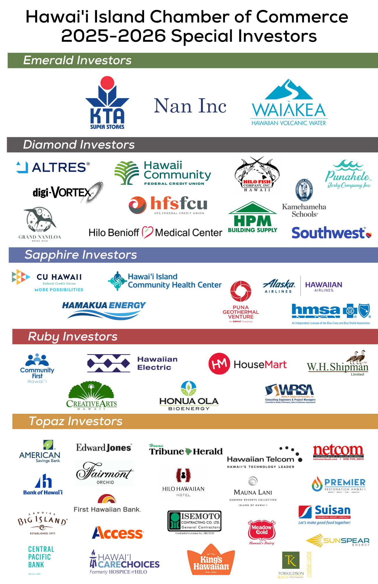 The purpose of the Hawai`i Island Chamber of Commerce is to assist businesses and promote the Island of Hawai`i. We provide leadership via services and advocacy for the business community while promoting the economic well-being of our island as a whole.